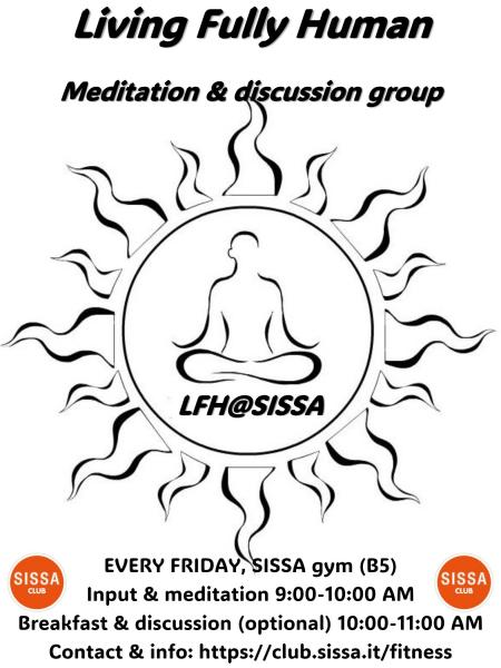 "Living Fully Human" is SISSA's weekly meditation and discussion group. We meet weekly on Friday mornings, 9:00-11:00 AM at SISSA gym (B5). The group is led by Valentin from APG (write to vpomakov@sissa.it if interested). We meditate together, drawing from different spiritual traditions, and discuss our experiences in topics related to spirituality, psychology, philosophy, activism, science etc. with the aim of becoming more compassionate, wiser, more connected, more active in society, and more fully human in this life we are given.
