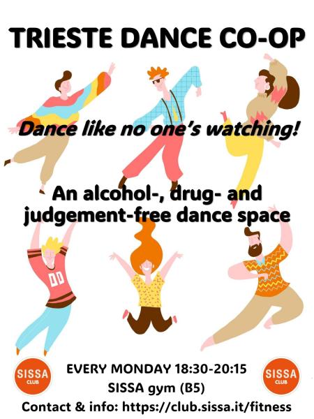 The “Trieste Dance Co-op” is Trieste’s new spontaneous dance group at SISSA club. This is a safe, free, friendly, welcoming space that is open to everybody and no previous dance experience is required. This dance space is not led by a teacher or facilitator; instead, everyone is free to move (or not) as they please, dancing, being playful, interacting (or not) with the others, rolling on the floor, freeing their minds and being authentic. We believe that, with a bit of practice, we do not need intoxicants to let go of our barriers and blockages and have fun, so we encourage a alcohol-, drug- and judgement-free dance space.